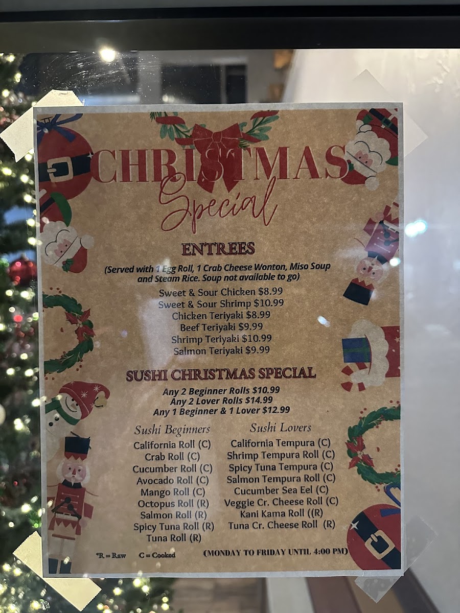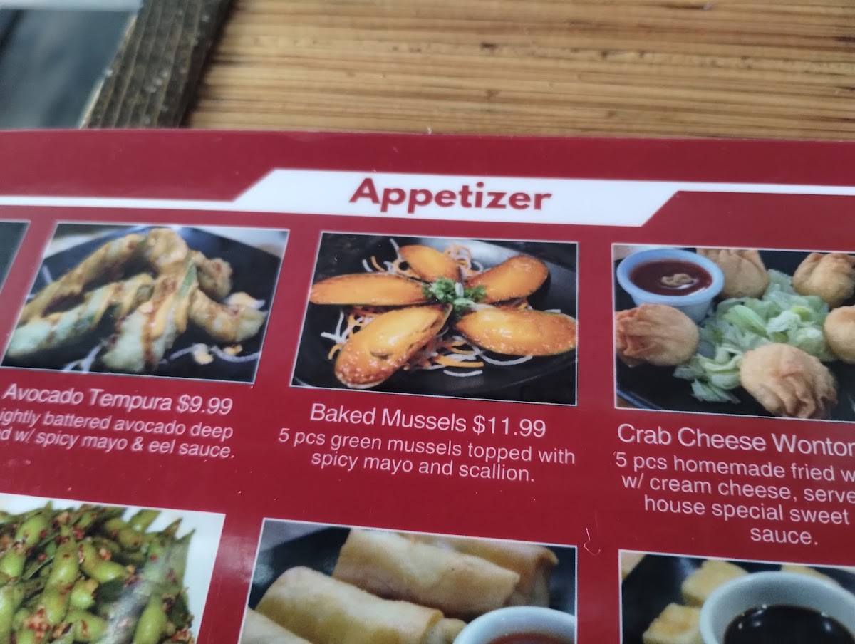 Crab meat, scallop, mango, avocado inside. Topped with white tuna, eel sauce, sriracha, special sauce, scallions and masago.